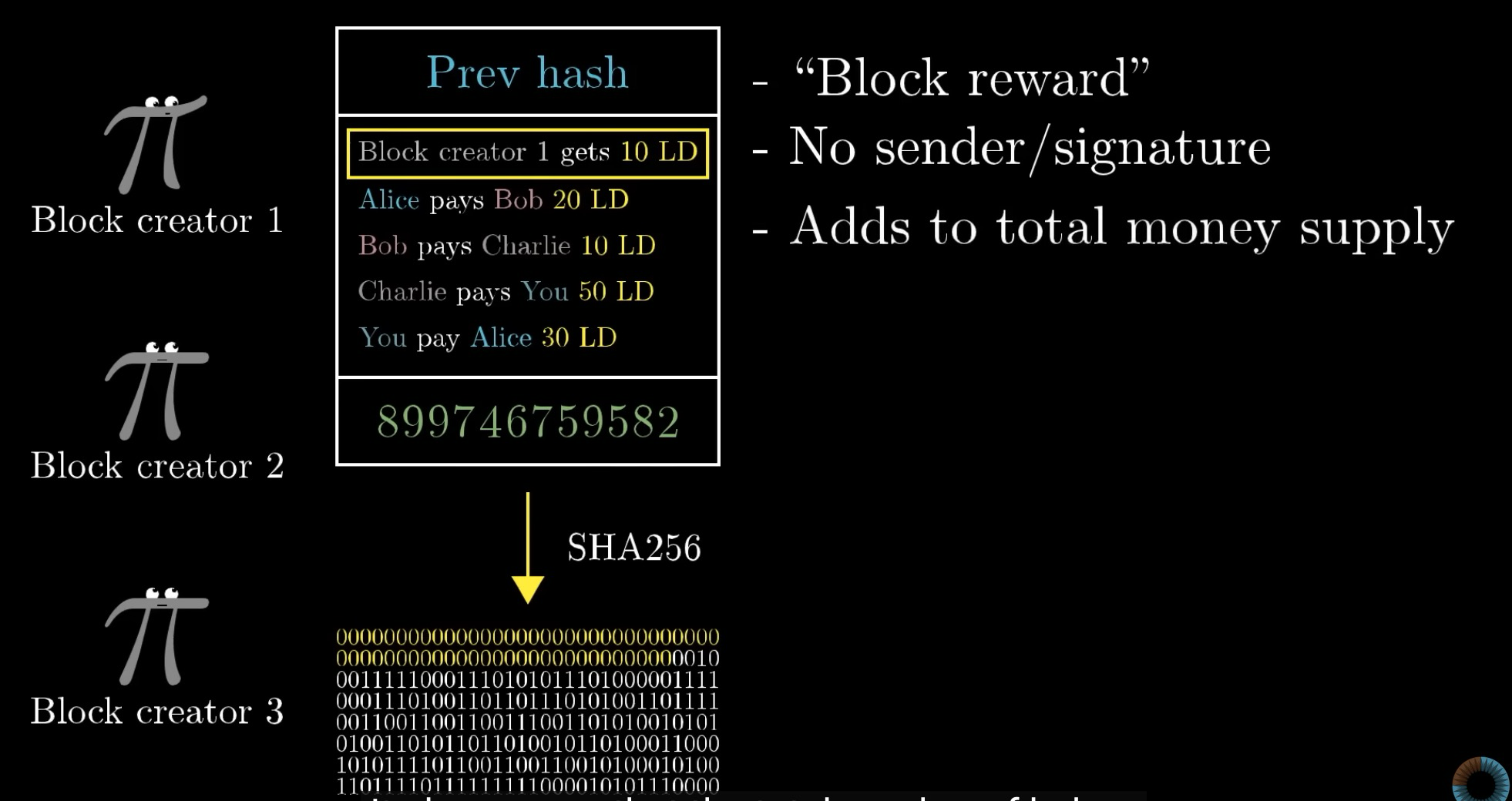 为了奖励发现区块的矿工,区块发现者允许在区块内插入一条特殊的交易记录,他能凭空获得一些比特币作为奖励,称为 block reward, block reward因为没有发送者,所以不需要签名。这些奖励会增加整个比特币网络的比特币数量.